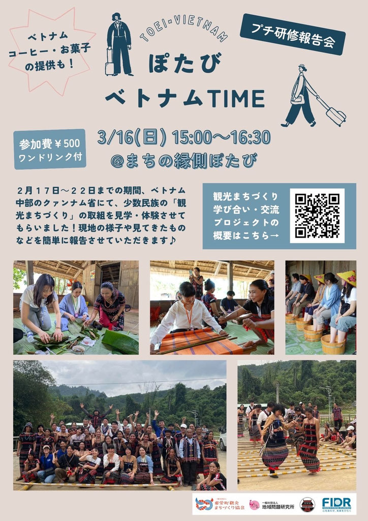 2025年2月、「観光まちづくり」に取り組むのメンバーとちもんけんメンバーが、ベトナム中部の都市クァンナム省にて、少数民族のみなさんが取り組む「観光まちづくり」を見学・体験させていただきました。プチ報告会では、 現地の様子や見てきたもの、感じたことなどをありのままに報告させていただきました。